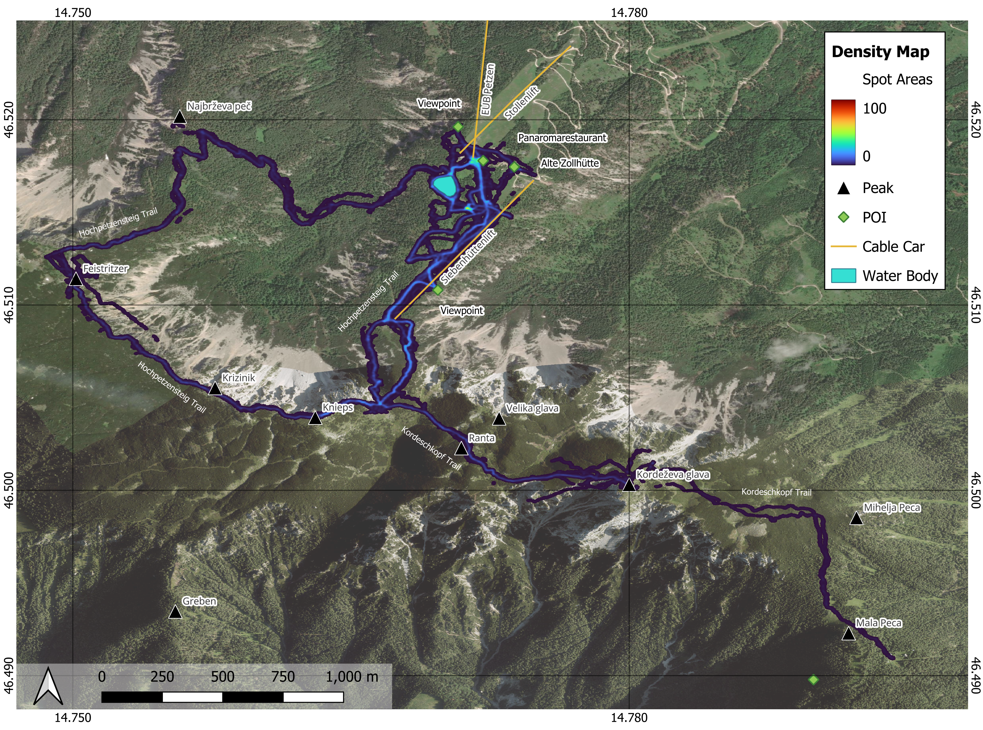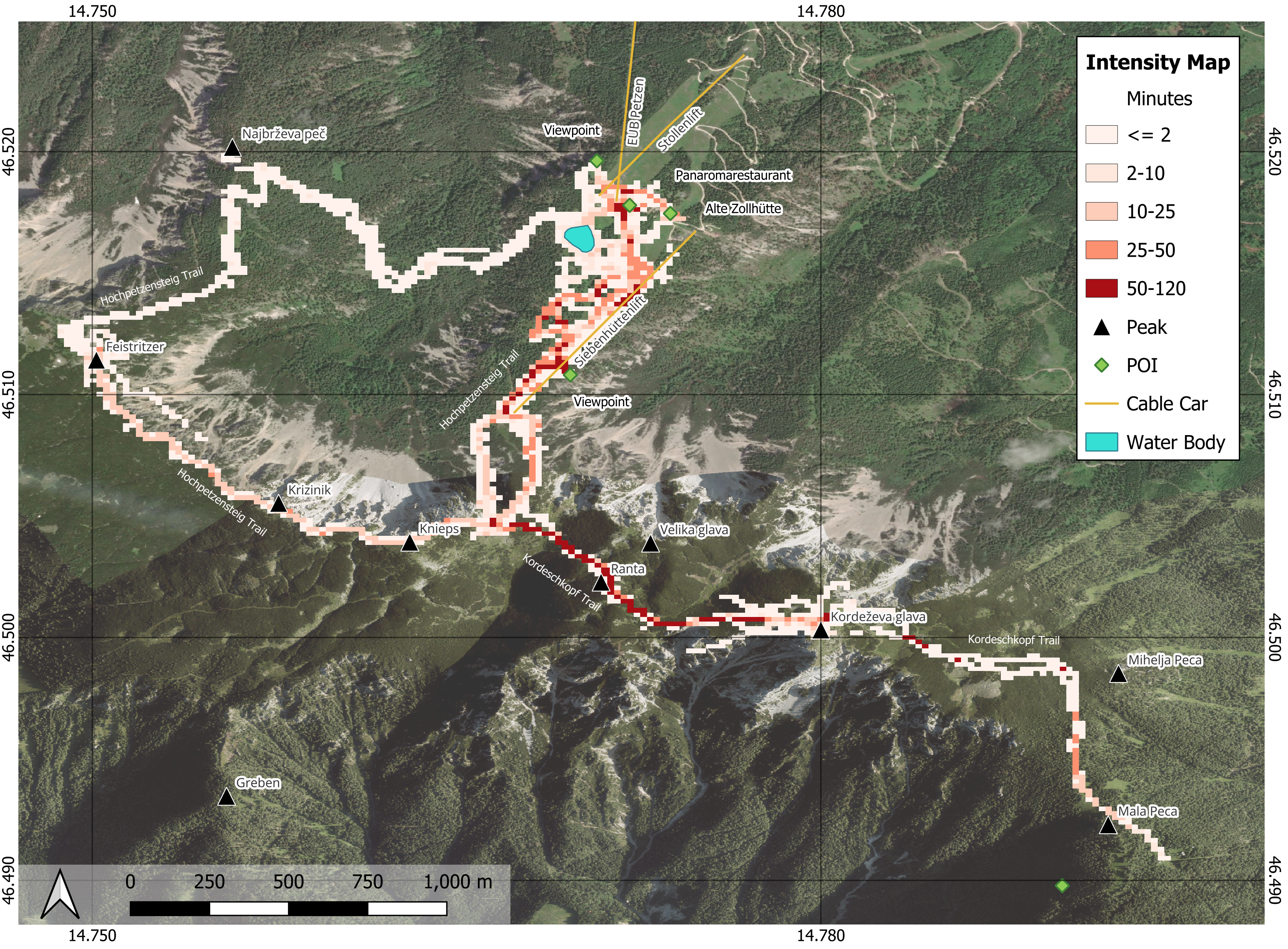 Within the Interreg CE project HUMANITA, 69 GPS loggers were deployed in the Karawanken–Karavanke UNESCO Global Geopark to analyze visitor movement patterns. After systematic data cleaning (removal of incomplete tracks, GPS errors, and outliers), the dataset was used to produce standardized visitor density and intensity maps.