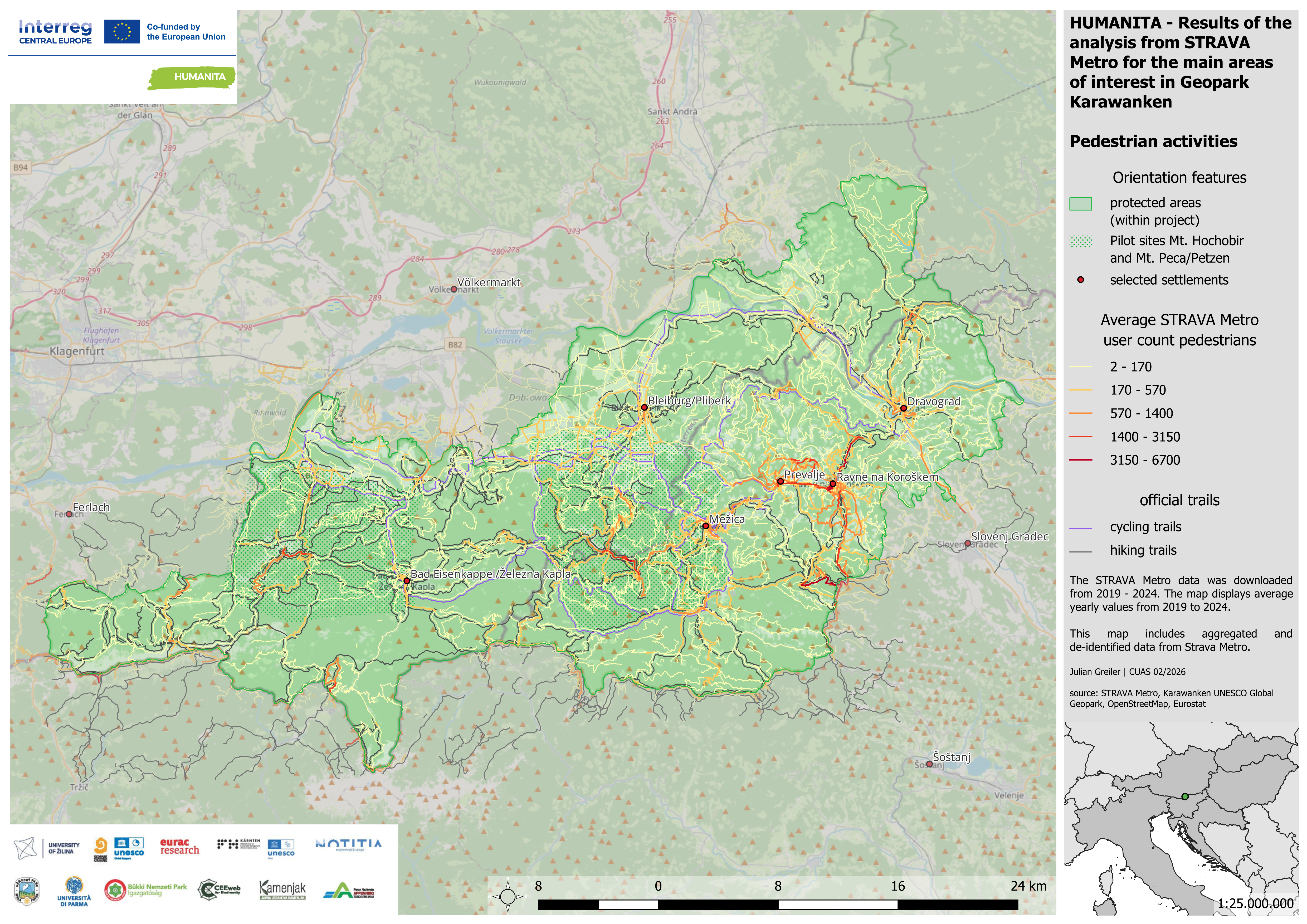 Within the Interreg Central Europe project HUMANITA, data from the outdoor and fitness apps Bergfex, Komoot, Outdooractive, Trailforks, and Strava were analyzed to estimate spatial hotspots and low-use areas in pilot regions. The objective was to identify officially promoted and unofficial user-generated activities that may indicate recreational trends, development potential, or conflicts within protected areas. Tour data were systematically organized and integrated into a GIS project. This enabled protected area managers to detect clusters of digitally promoted routes, identify potentially problematic trails in sensitive zones, and proactively manage online content where necessary. The analysis provided strategic insights into how digital platforms shape visitor distribution and perception of landscapes.