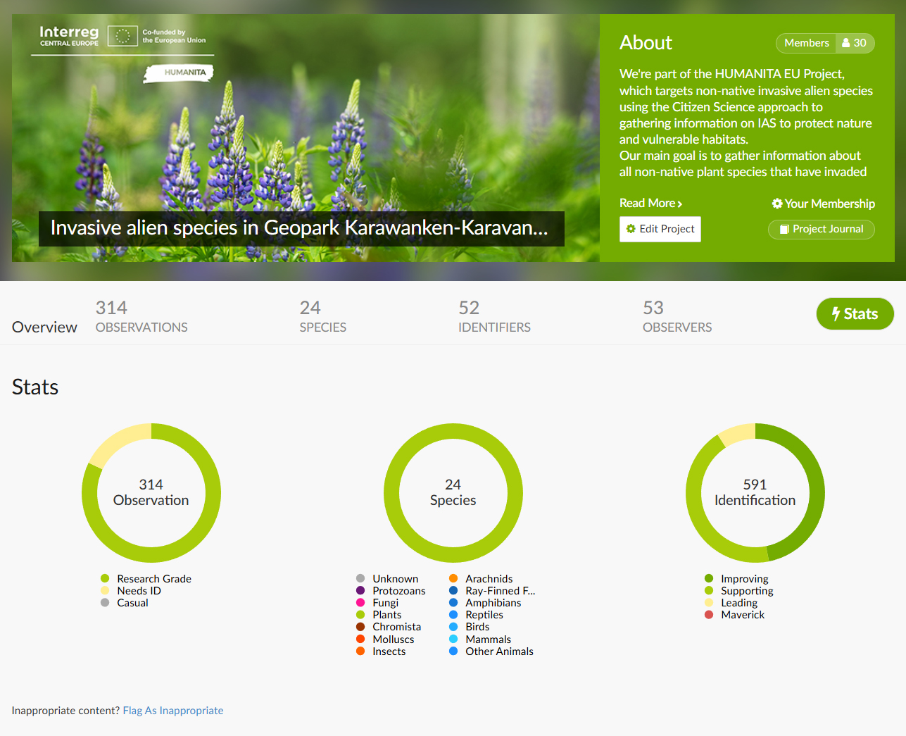 For the “Invasive plants in view” initiative, started during the Interreg CE project HUMANITA, iNaturalist was used to actively involve visitors, and local stakeholders in documenting invasive plant species. Clear communication about priority invasive species and simple identification guides improved information. It was demanding to reach visitors and locals to contribute data, even after 6 dedicated workshops in the pilot area arranged by Carinthia University of Applied Sciences and their partners, participation in the Long Night of Research to promote the project, direct communication to already active iNaturalist users, the involvement of the Citizen Science network Austria and the production of posters, flyers and information brochures only around 300 observations could be reached in 2 vegetation periods. This experience highlights that alot of communication effort is necessary to involve citizens in monitoring programs using apps like iNaturalist.